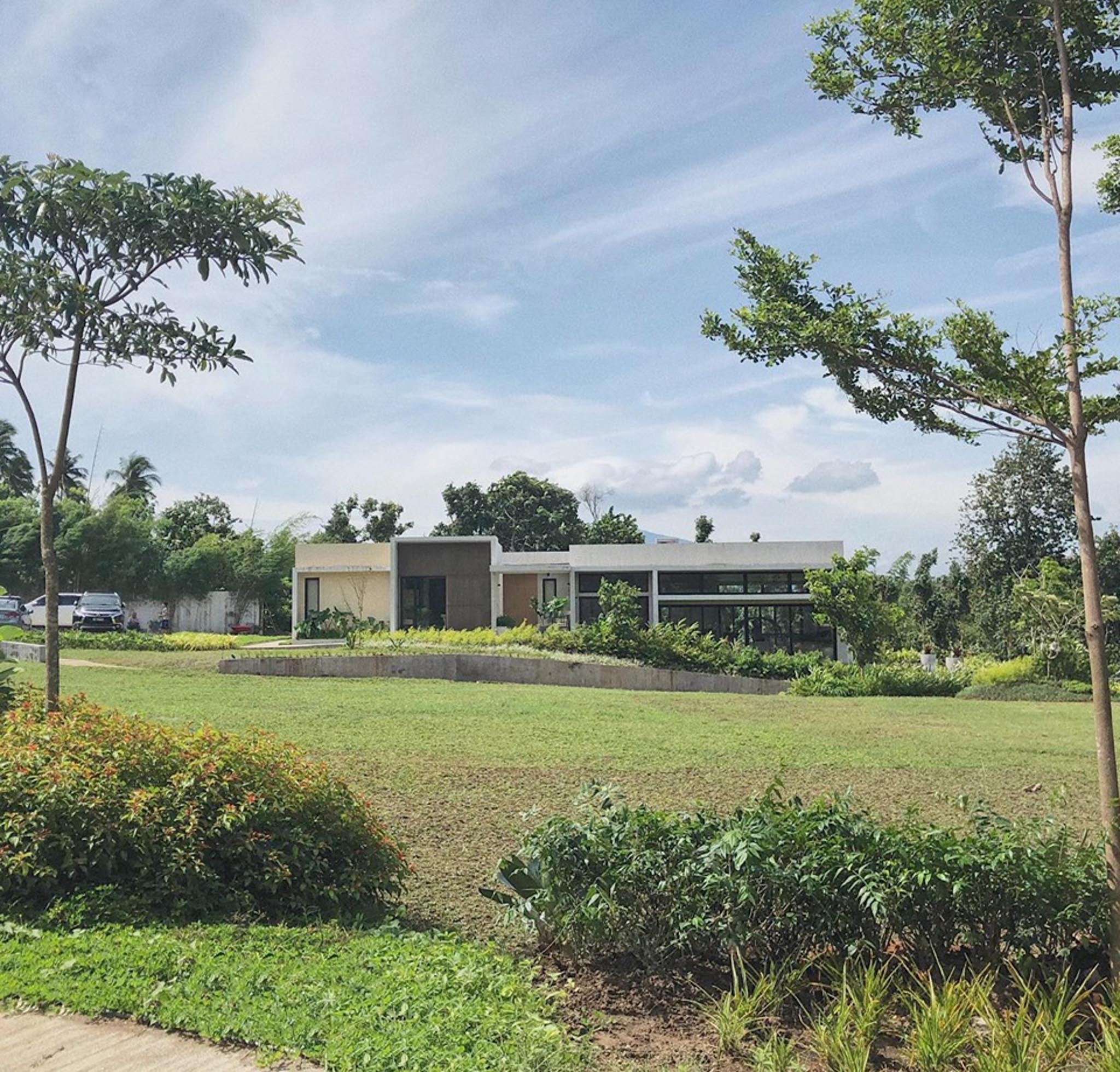 The dining and living areas have large sliding doors that open to the garden and provide views of the lawn beyond. The south-facing facade’s exposure to the sun is reduced by its extensive eaves. The guests can see the infinity pool and the dragon fruit field beyond from the opposite side of the living room.